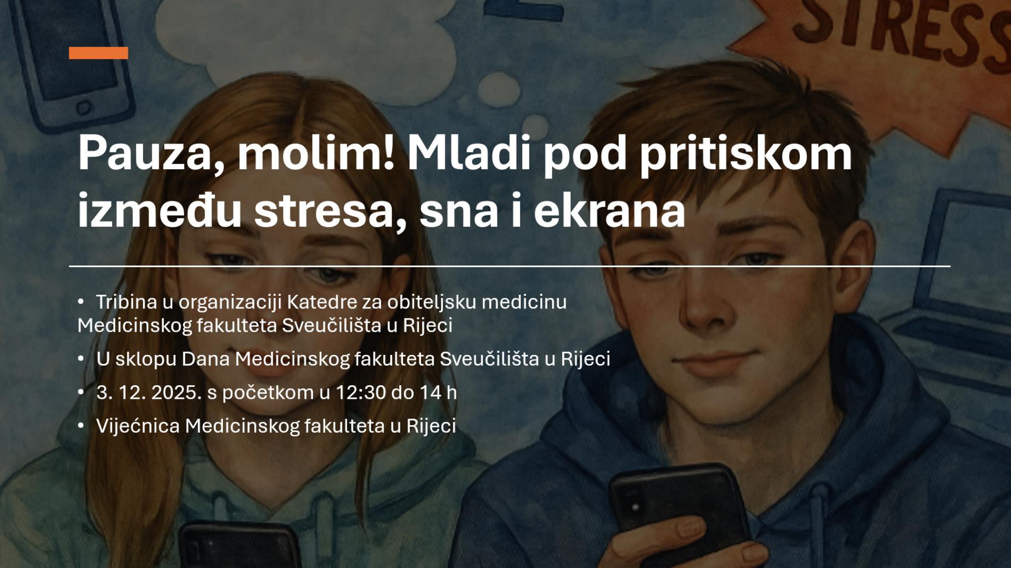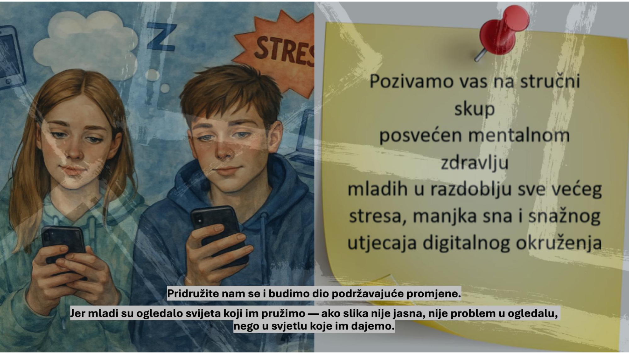 U vremenu kada se mladi suočavaju s brojnim izazovima, od preopterećenosti informacijama i stalne povezanosti s ekranima do rastućeg stresa i teškoća sa spavanjem, tribina „Pauza, molim! Mladi pod pritiskom između stresa, sna i ekrana“ otvara prostor za razgovor o mentalnom zdravlju, razumijevanju i podršci.