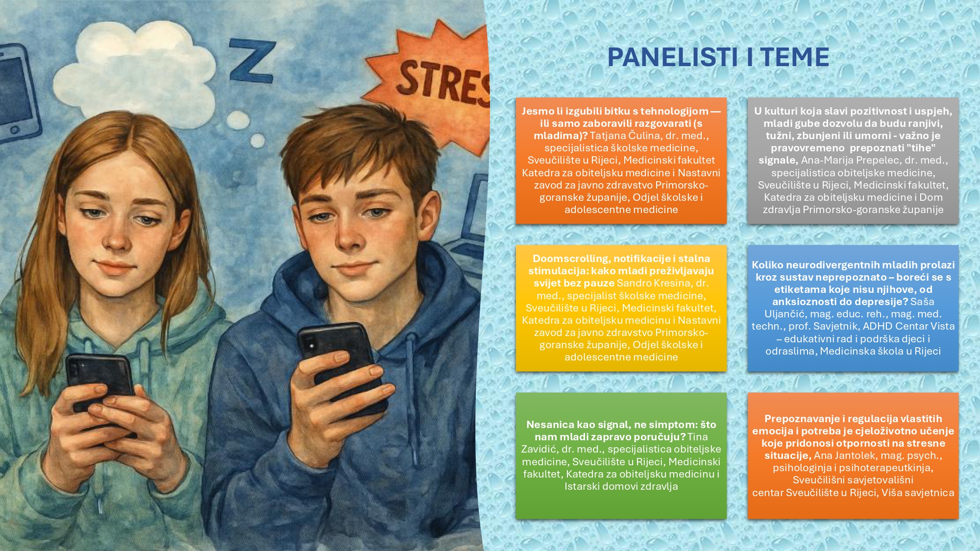 Tribina će biti posvećena ranoj detekciji teškoća mentalnog zdravlja i ulozi primarne zdravstvene zaštite u prepoznavanju i podršci mladima. Govorit će se o poteškoćama s pažnjom i koncentracijom, poremećajima spavanja, suvremenim ovisnostima, osobito ekranizmu, ali i o preplavljenosti, osjećaju izgubljenosti u virtualnom svijetu te rastućem stresu i emocionalnoj iscrpljenosti među adolescentima.